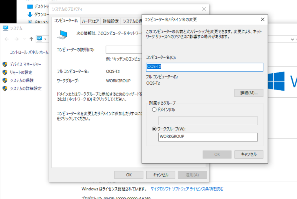 コンピューター名をネットワークの画面から、わかりやすい名前に変更しておきます。標準のままだとDESKTOP-xxxxxxみたいな名前ですよね? どれだかわからないと思います。わかりやすいような名前、例えば “onshi-1″とか”OQS-1″とかにしてみるのはどうでしょうか?