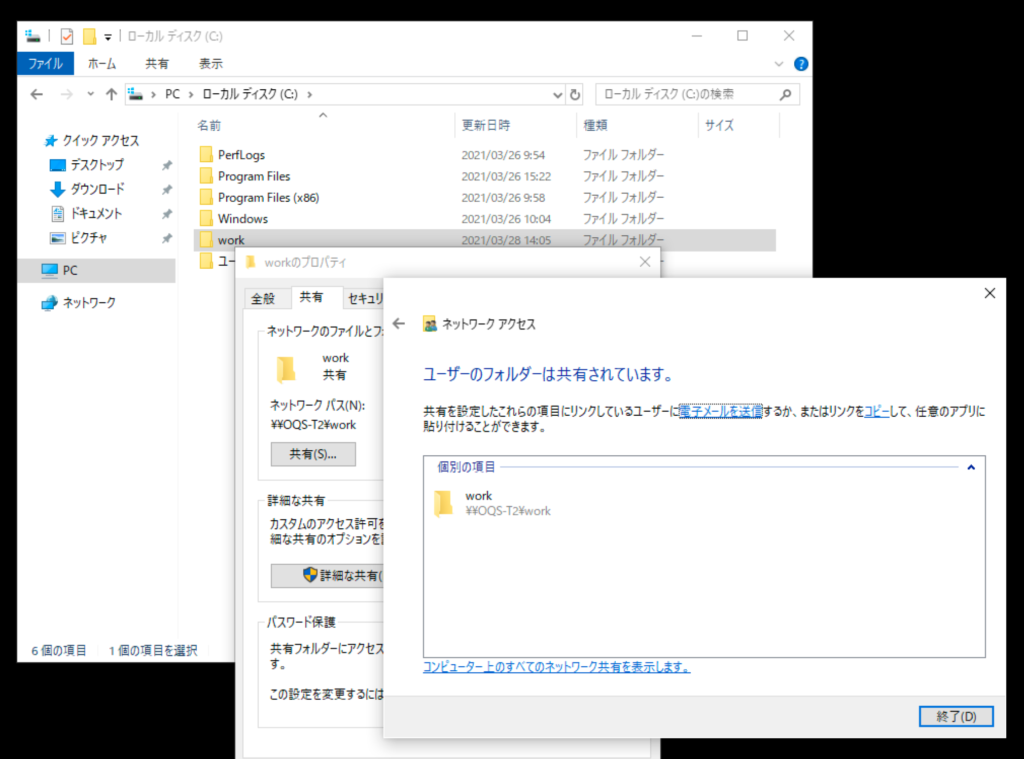 まずは、何でも良いのですが、エクスプローラーで、Cドライブに、workと言うフォルダを作成してみましょう。フォルダを右クリックして、共有をしていきます。共有をかけたら、「読み書き可能」に設定します。(所有者でも同等なので、平気です。)
