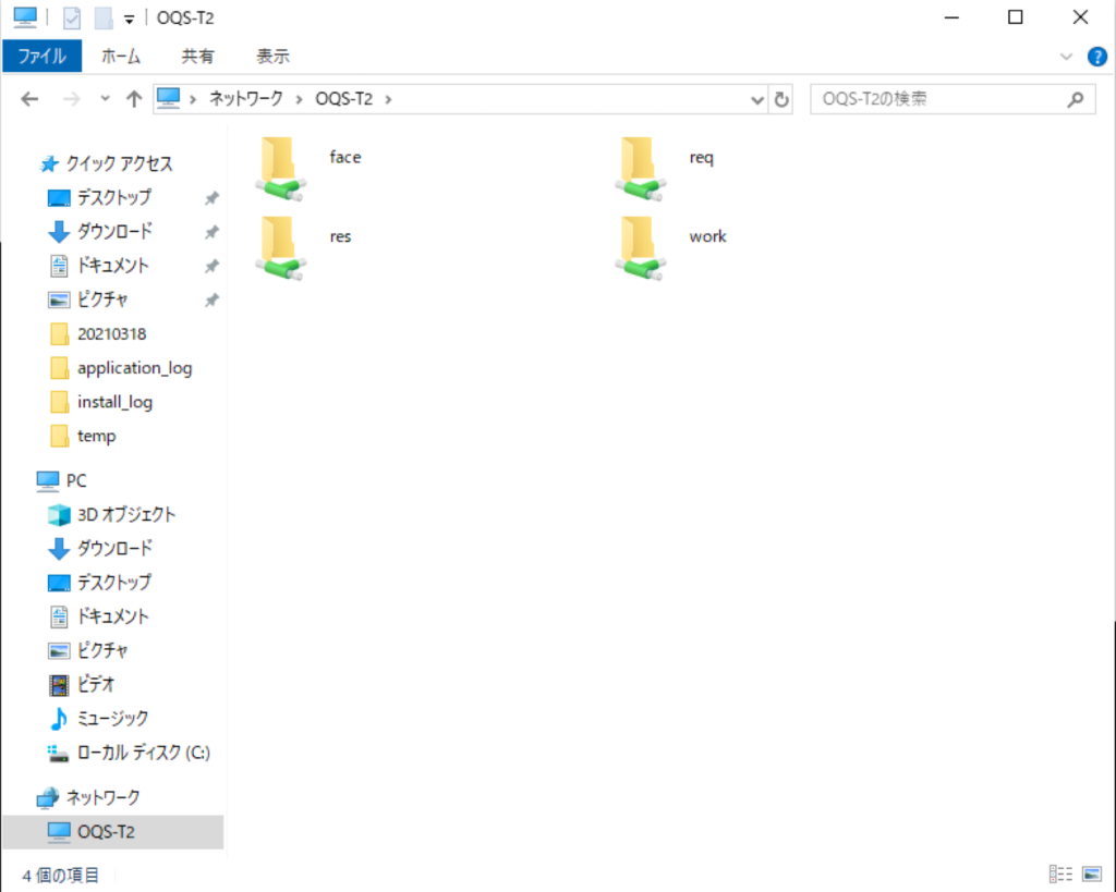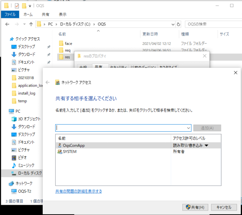 インストールを実行したら、自動的に、C:¥OQS¥req と C:¥OQS¥res が作成されています。それら2つのフォルダを共有設定します。フォルダを右クリックして、プロパティを表示させて、その中の「共有」から行います。